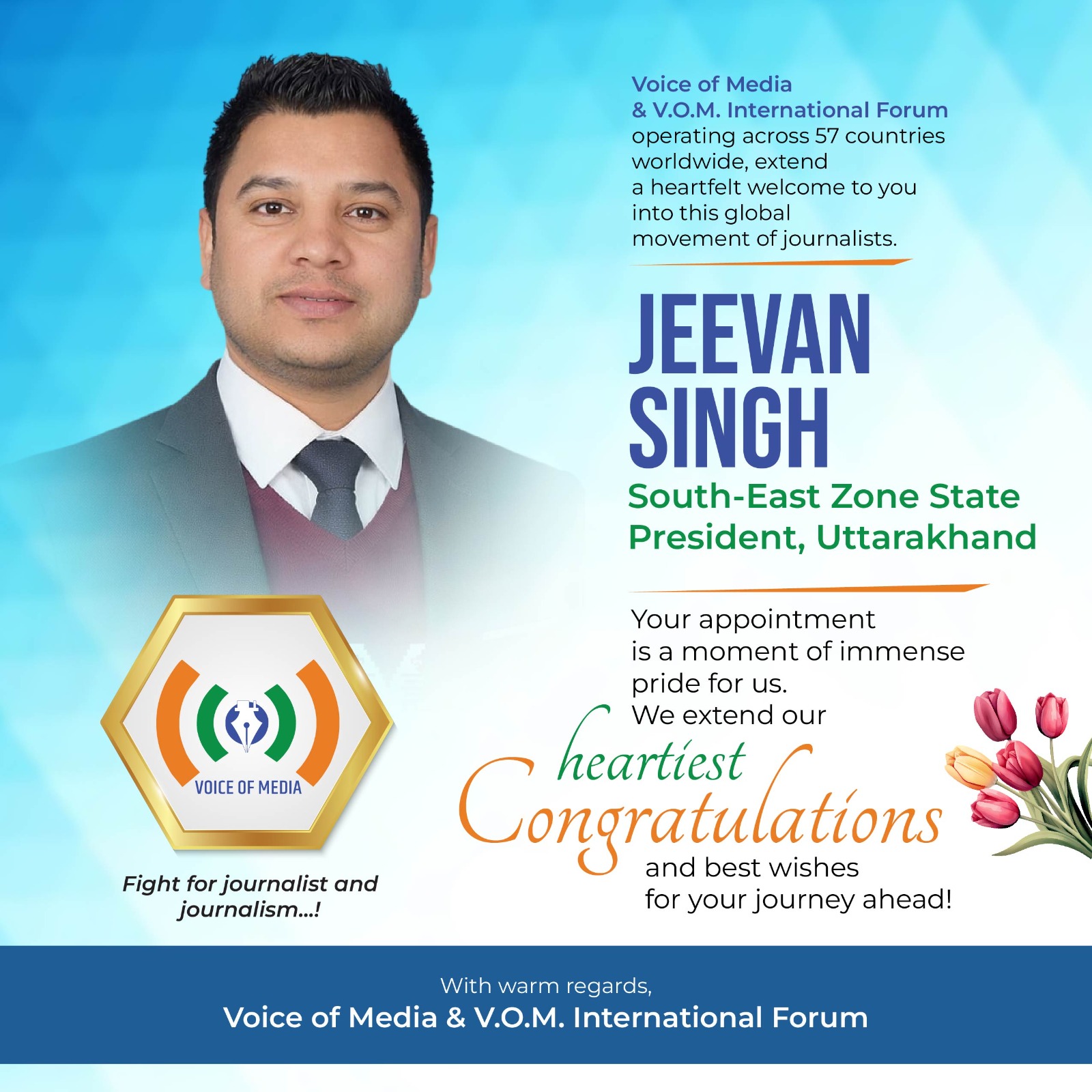 चंपावत । वॉइस ऑफ मीडिया संगठन में संगठनात्मक विस्तार को लेकर महत्वपूर्ण निर्णय लेते हुए जीवन सिंह बिष्ट को कुमाऊ अध्यक्ष नियुक्त किया गया है। यह जिम्मेदारी संगठन के राष्ट्रीय अध्यक्ष संदीप काले तथा राष्ट्रीय महासचिव दिव्य भौंसले द्वारा उन्हें सौंपी गई।उन्होंने संगठन को प्रदेश स्तर पर सशक्त बनाने, मीडिया कर्मियों को एक मंच पर जोड़ने तथा समाजहित में सकारात्मक पहल करने का संकल्प भी व्यक्त किया।इस अवसर पर राष्ट्रीय अध्यक्ष संदीप काले ने कहा कि जीवन सिंह बिष्ट के अनुभव, समर्पण और कार्यशैली से संगठन को कुमाऊं में नई ऊर्जा मिलेगी। वहीं राष्ट्रीय महासचिव दिव्य भौंसले ने विश्वास जताया कि उनके नेतृत्व में वॉइस ऑफ मीडिया का विस्तार और अधिक प्रभावी ढंग से होगा। संगठन के पदाधिकारियों एवं सदस्यों ने तथा प्रदेश के अध्यक्ष ने भी जीवन सिंह बिष्ट को शुभकामनाएं दीं और उज्ज्वल कार्यकाल की कामना की।