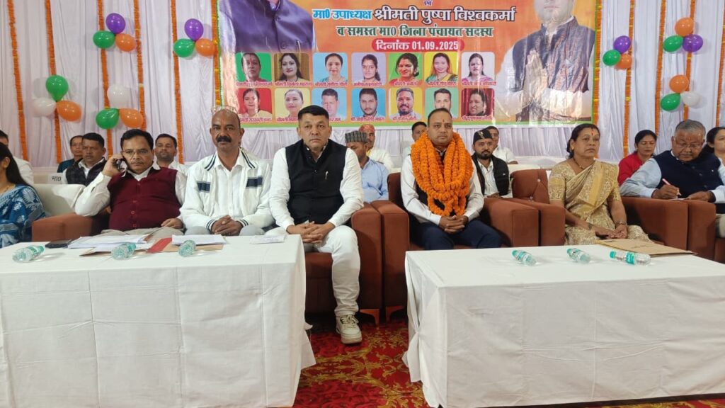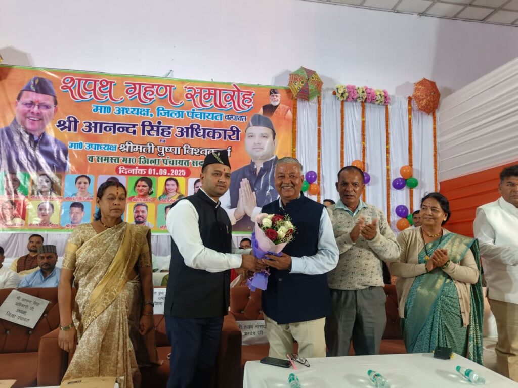 चंपावत। जिला पंचायत के नवनिर्वाचित प्रतिनिधियों के शपथ ग्रहण के बाद से जिला पंचायत का बोर्ड अस्तित्व में आ गया है। जिलाधिकारी मनीष कुमार के आपदा ग्रस्त क्षेत्रों में होने के कारण उनके प्रतिनिधि के रूप में सीडीओ डॉ जीएस खाती ने नवनिर्वाचित जिला पंचायत अध्यक्ष आनंद अधिकारी, उपाध्यक्ष पुष्पा विश्वकर्मा को शपथ दिलाई जबकि बाद में स्वयं अध्यक्ष द्वारा 9 महिलाओं सहित 4 पुरुष जिला पंचायत सदस्यों को शपथ दिलाई गई। जिला पंचायत बोर्ड में कुल 15 सदस्य हैं भाजपा जिला अध्यक्ष गोविंद सामंत की अध्यक्षता, जिला पंचायत के अपर मुख्य अधिकारी कमलेश बिष्ट एवं मोहित पाठक के संचालन में हुए समारोह में मुख्य अतिथि दर्जा राज्य मंत्री श्याम नारायण पांडे ने सभी को बधाई देते हुए कहा मुख्यमंत्री के मॉडल जिले में जनप्रतिनिधियों द्वारा ग्रामीण अर्थव्यवस्था की मजबूती के लिए समर्पित होकर कार्य करना होगा।